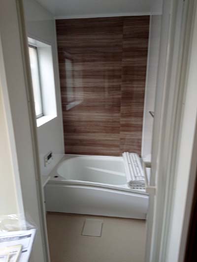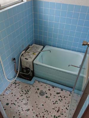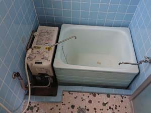 お風呂場。タイル貼りの在来工法で、湯沸かし器が室内にあるので、浴槽がとても狭いですね。