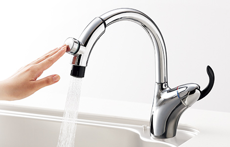 ※タッチスイッチタイプ ⇒ 手がよごれているときも、水の出し止めが簡単です。こまめに止水できるので節水にも役立ちます。